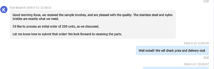 « Bonjour Rosa, nous avons bien reçu les échantillons de brosses et nous sommes ravis de leur qualité. Les poils en acier inoxydable et en nylon correspondent exactement à ce dont nous avions besoin. »